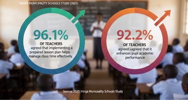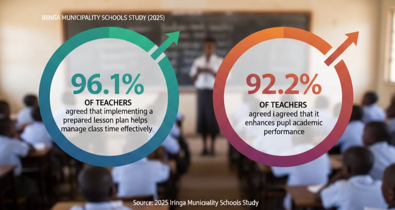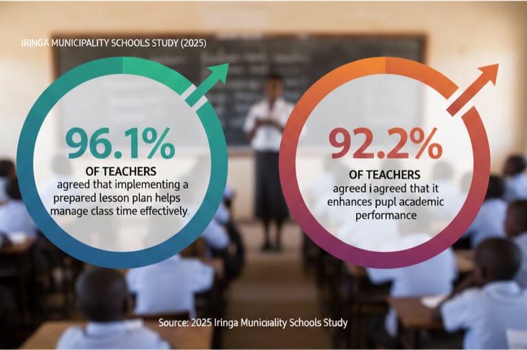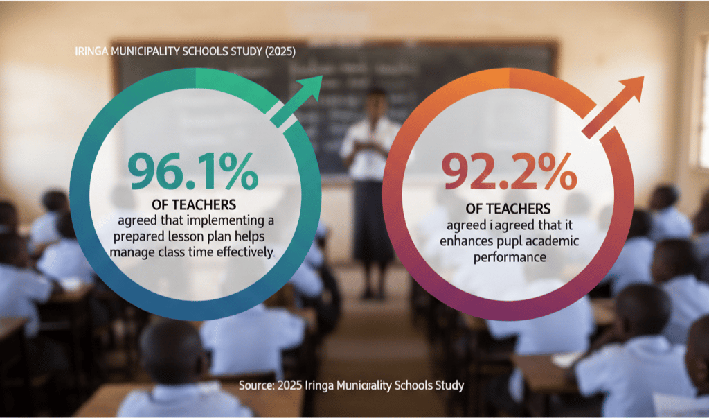 In a 2025 study in Iringa Municipality schools, 96.1% of teachers agreed that implementing a prepared lesson plan helps manage class time effectively, and 92.2% agreed that it enhances pupil academic performance and participation. These findings suggest that teachers see structured planning as beneficial for organization and student engagement. (RSIS International)