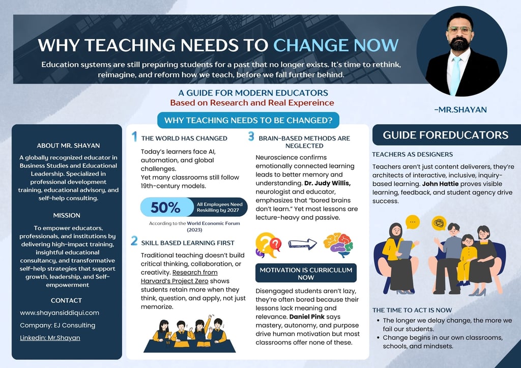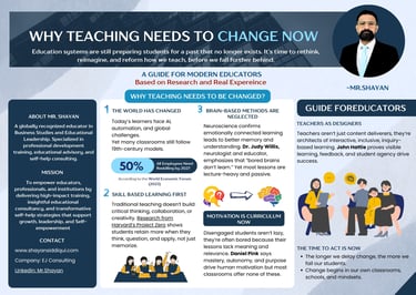In this article we have briefly discussed why urgent change in teaching is essential for educators. With valid references we explore how to close the skills gap, adapt to AI, support student wellbeing, and lead meaningful classroom transformation.